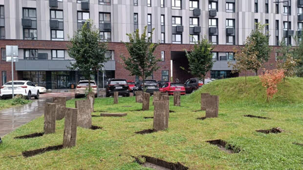 Во дворе жилого комплекса «Первый Московский» на улице Бианки рабочие подняли декоративные плиты для проведения коммунальных работ, оставив их в таком виде на некоторое время. Жители комплекса в шутку сравнили конструкцию с кладбищем.