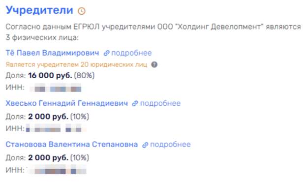И кто же занимался столь дорогим ремонтом, спросите вы? Совершенно, верно, еще одна структура Павла Те. А именно "Инвестпрофи". Интерес девелопера угадывается легко: 75% структуры владеет ООО "Холдинг Девелопмент". В свою очередь, 80% последнего принадлежит лично Павлу Те. Оставшиеся 25% "Инвестпрофи" скрыты в ЗПИКФ "Траст Инвест", скрываться за которым может кто угодно. Да хоть те же предполагаемые родственники Натальи Сергуниной - Сафаниевы.